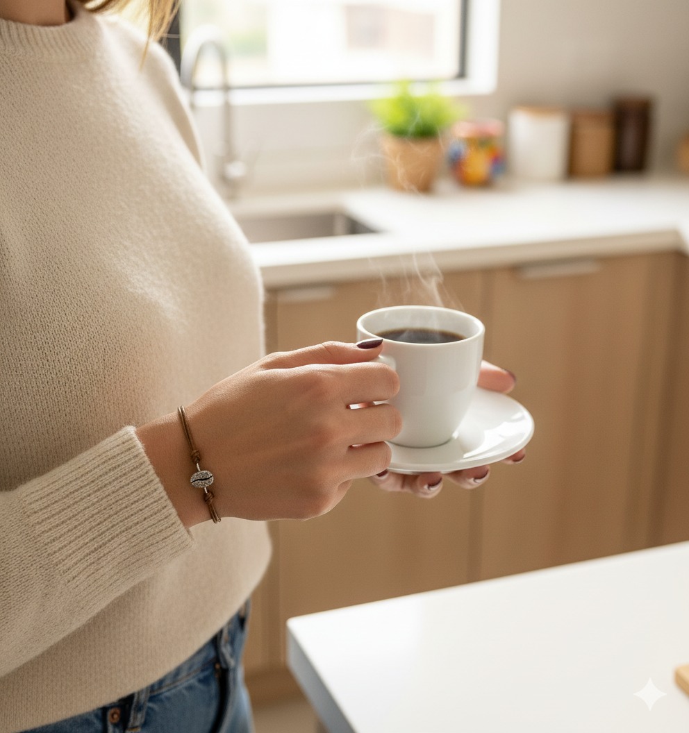 • Diseño: El dije central es una rĂ©plica exacta y detallada de un grano de cafĂ©, con su caracterĂ­stica ranura central, logrando un realismo excepcional.